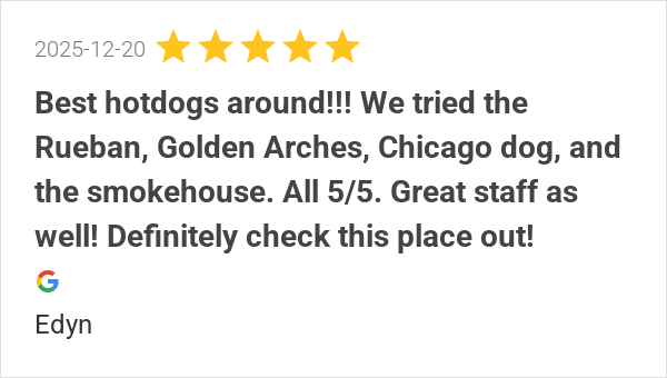 Best hotdogs around!!! We tried the Rueban, Golden Arches, C...
