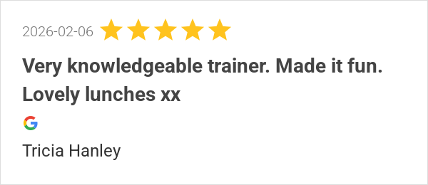 Very knowledgeable trainer. Made it fun. Lovely lunches xx