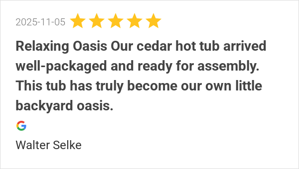 Relaxing Oasis Our cedar hot tub arrived well-packaged and r...