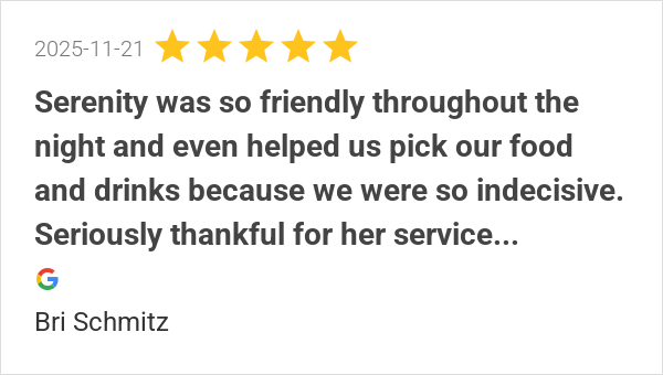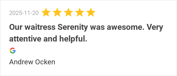 Our waitress Serenity was awesome. Very attentive and helpfu...