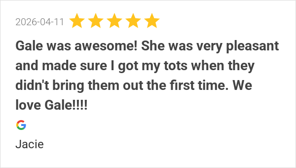 Gale was awesome! She was very pleasant and made sure I got ...