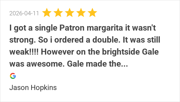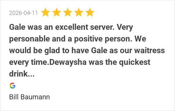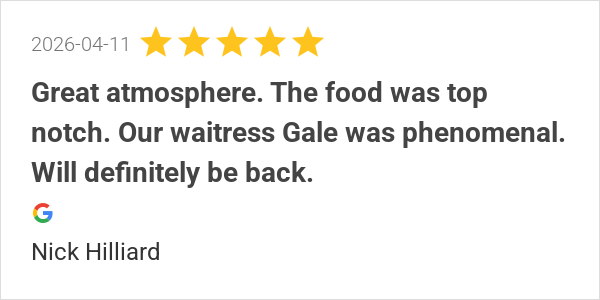 Great atmosphere. The food was top notch. Our waitress Gale ...