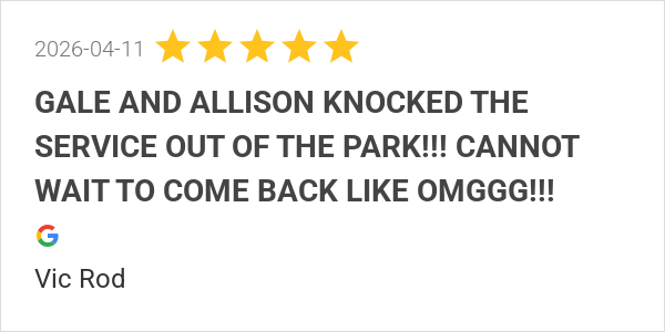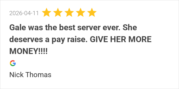 Gale was the best server ever. She deserves a pay raise. GIV...