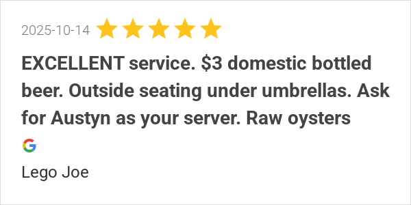 EXCELLENT service. $3 domestic bottled beer. Outside seating...