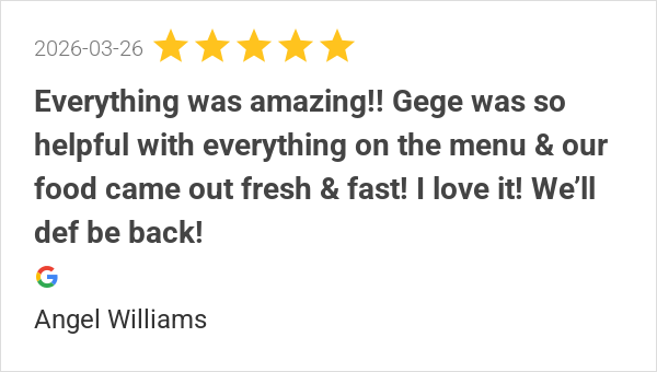 Great food and Gege was fantastic 10/10 would recommend