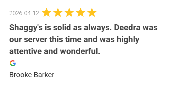 Shaggy's is solid as always. Deedra was our server this time...