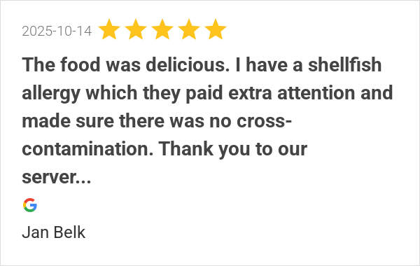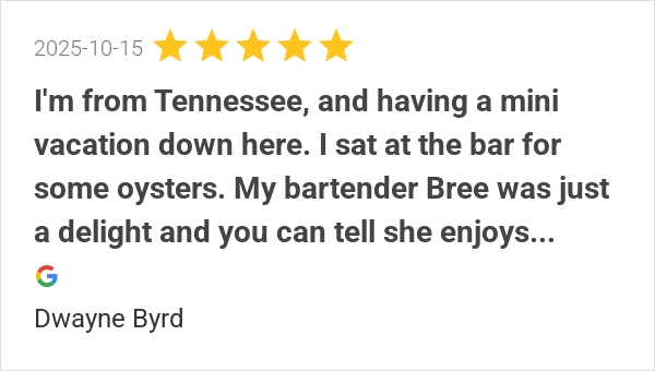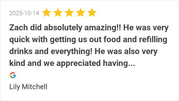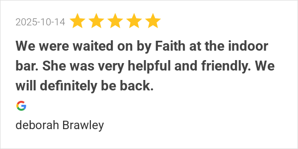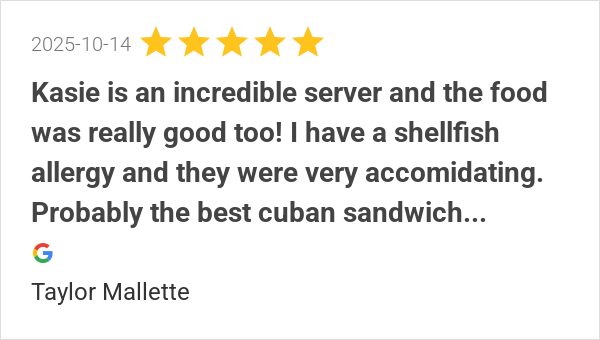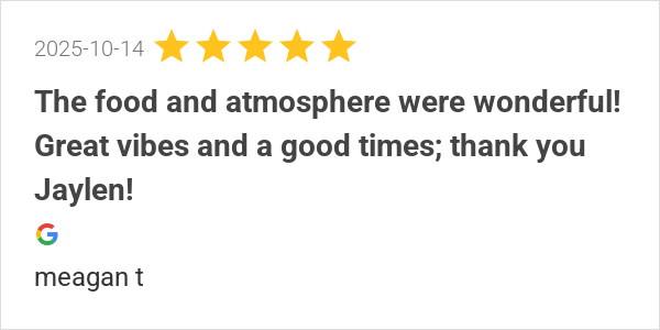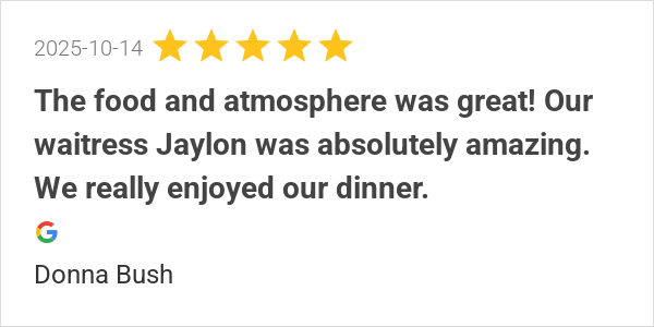 The food and atmosphere was great! Our waitress Jaylon was a...