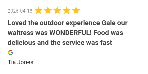 Loved the outdoor experience Gale our waitress was WONDERFUL...