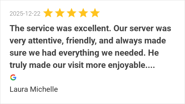 Our server was very attentive, friendly, and always made sur...