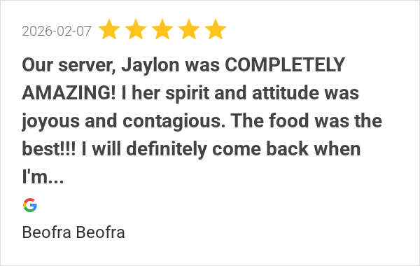 Our server, Jaylon was COMPLETELY AMAZING! I her spirit and ...