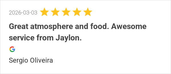 Great atmosphere and food. Awesome service from Jaylon.