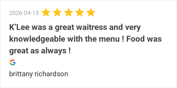 K’Lee was a great waitress and very knowledgeable with the m...