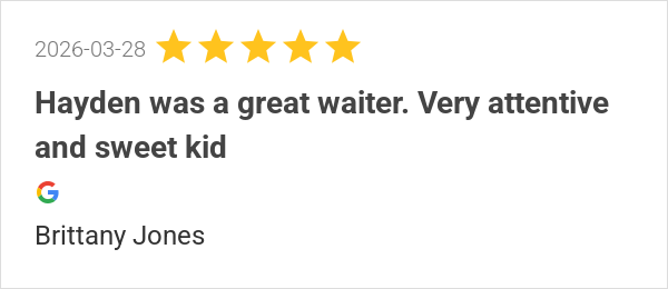 Great food! Our server Hayden was amazing nice and chill.