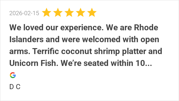 Terrific coconut shrimp platter and Unicorn Fish. We’re seat...