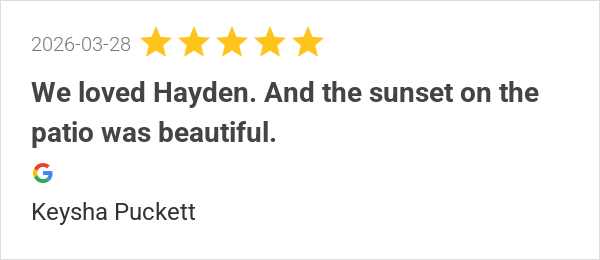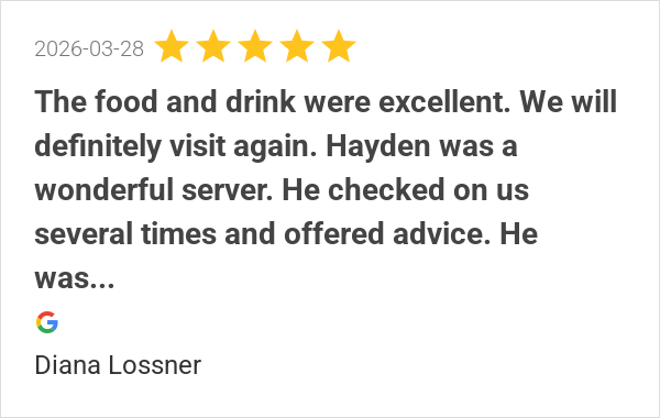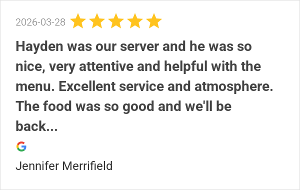 Absolutely delicious. Jaylon was great. Warm and welcoming w...