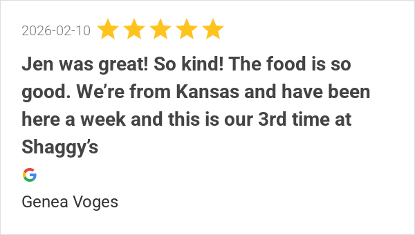 We ate at Shaggy's recently and thoroughly enjoyed the food,...