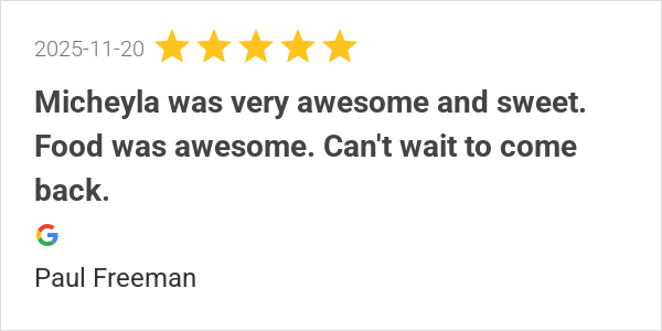 Micheyla was very awesome and sweet. Food was awesome. Can't...