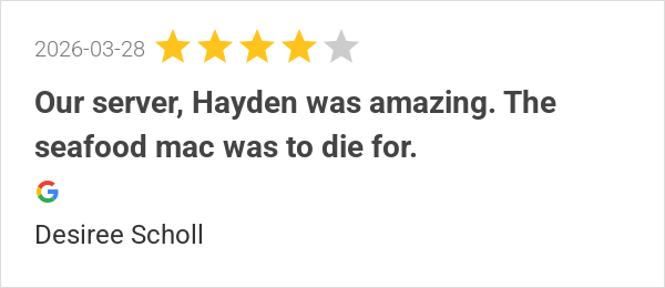 Our server, Hayden was amazing. The seafood mac was to die f...