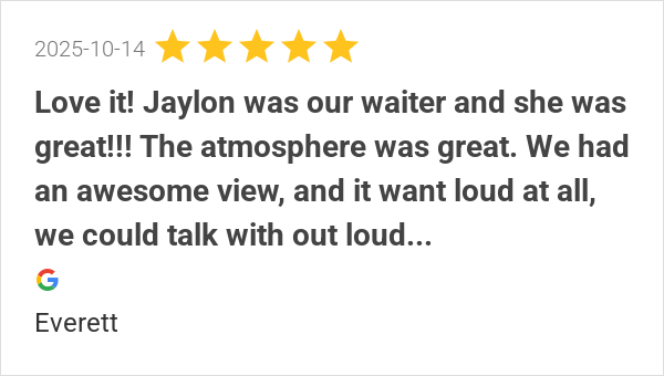 Love it! Jaylon was our waiter and she was great!!! The atmo...