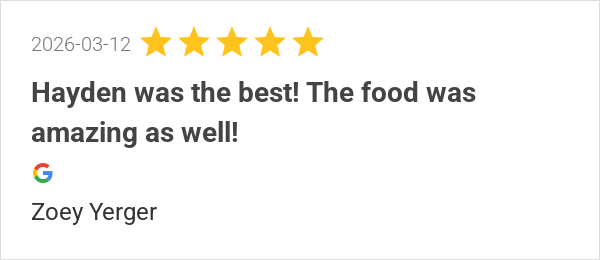 Hayden was the best! The food was amazing as well!