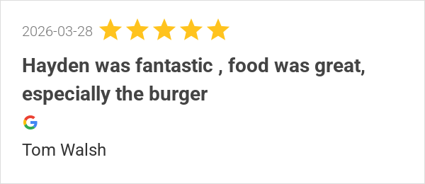 Hayden was fantastic , food was great, especially the burger