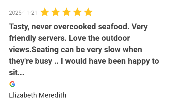 Tasty, never overcooked seafood. Very friendly servers. Love...