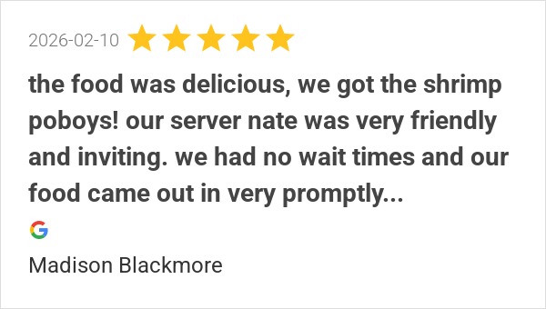the food was delicious, we got the shrimp poboys! our server...