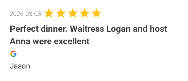 Perfect dinner. Waitress Logan and host Anna were excellent