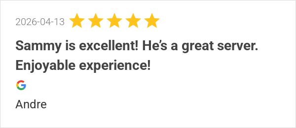 Sammy is excellent! He’s a great server. Enjoyable experienc...
