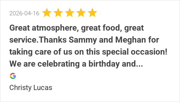 Great atmosphere, great food, great service.Thanks Sammy and...