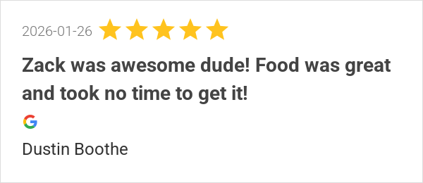 Zack was awesome dude! Food was great and took no time to ge...