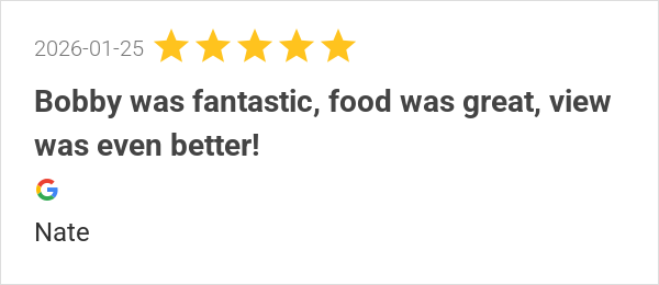 Bobby was fantastic, food was great, view was even better!