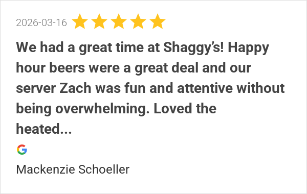 We had a great time at Shaggy’s! Happy hour beers were a gre...