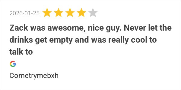 Zack was awesome, nice guy. Never let the drinks get empty a...